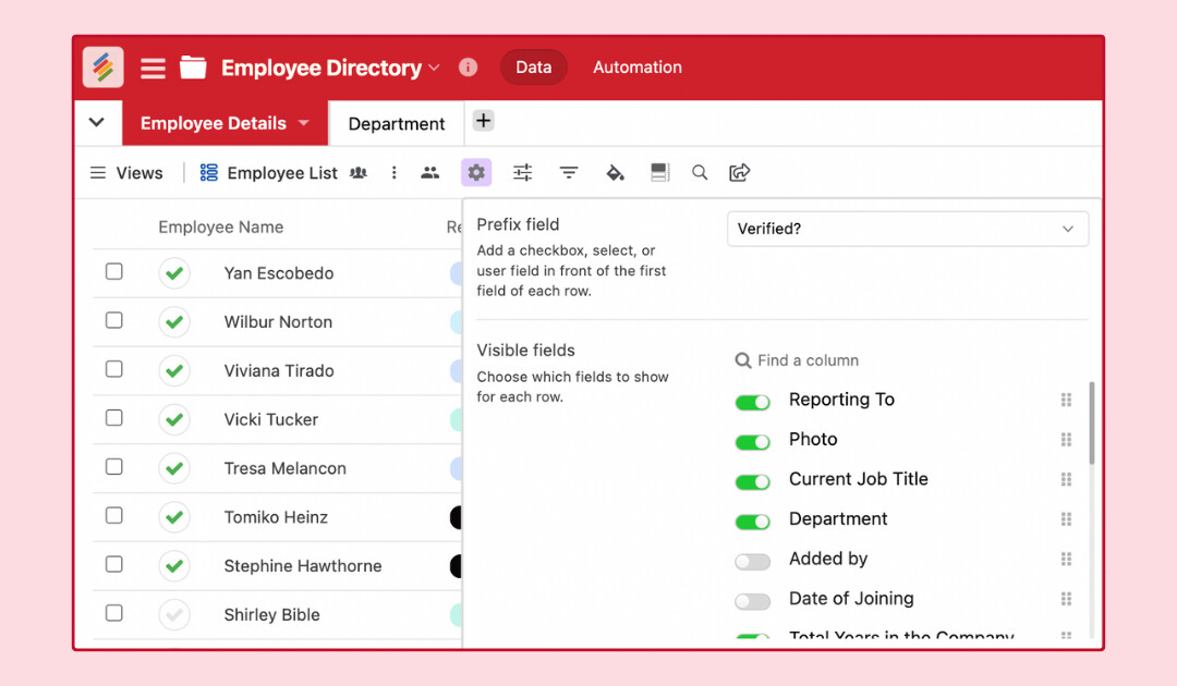 - Prefix Fields: You can add specific column types—like single option, checkbox, and collaborator columns—as “prefix fields.” These will display right before the primary column for better visualization.
